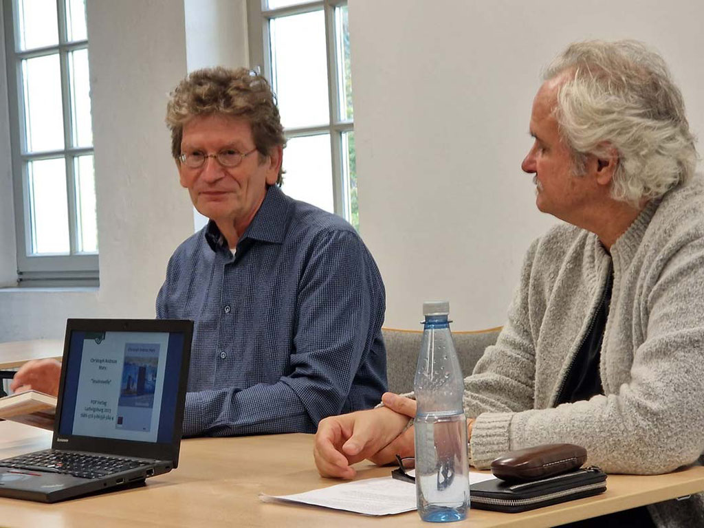 Am Samstagnachmittag fand – ebenfalls inzwischen ein festes Format im Rahmen der Literaturtage – die öffentliche Büchervorstellung in der Akademie Faber-Castell statt. Literarische Neuerscheinungen und Projekte der Mitglieder standen auf dem Programm. Insgesamt zehn Kolleginnen und Kollegen präsentierten, moderiert von Marcus Neuert, ihre neuen Werke. Das große Reservoir reichte von Gedichtbänden, Kurzgeschichten, Novellen, Romanen bis hin zu Sachbuchveröffentlichungen und vermittelte den Anwesenden einen beeindruckenden Querschnitt durch das Schaffen der KOGGE-Autorinnen und -Autoren.
