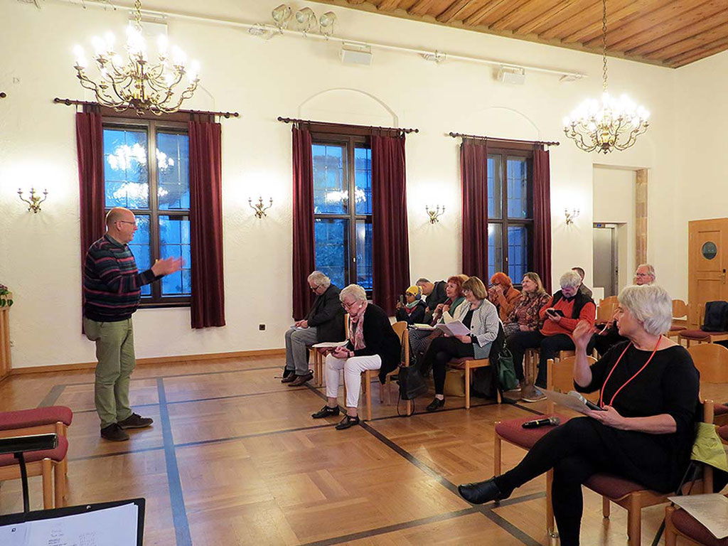 Die Matinee am Sonntag im Rathaussaal war noch einmal einem Vortrag zum Tagungsthema gewidmet, den Pavel Novotný, eingeführt von KOGGE-Präsident Uli Rothfuss, zum Thema "Sprache in Stereo. Literatur als auditives Phänomen" hielt. Bei einem kleinen Imbiss im Rathausfoyer ließen die Besucher und KOGGE-Mitglieder die Tagung ausklingen.
