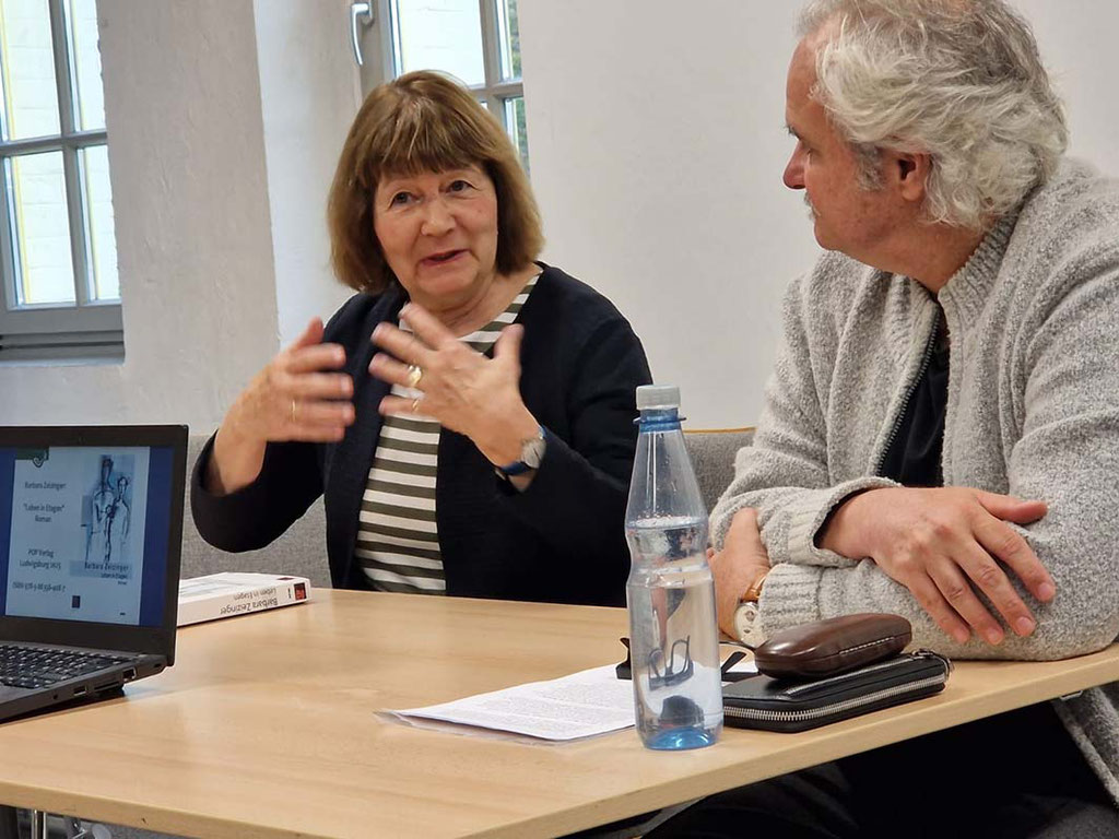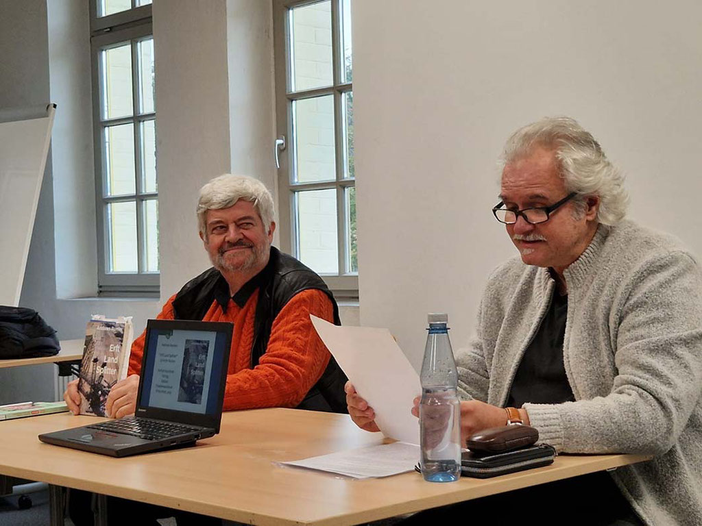 Endlich wieder live! Nach dem pandemiebedingten Ausfall der KOGGE-Literaturtage 2020 und der Verkürzung auf eine Online-Mitgliederversammlung 2021 konnte in diesem Jahr das geplante Programm mit Literatinnen, Literaten und Gästen in vollem Umfang stattfinden. Neben einer facettenreichen Diskussionsrunde zum Tagungsthema "Ich traue dem Frieden nicht" nach einem Ilse-Aichinger-Zitat waren dies neben der internen Versammlung der Mitglieder eine Buchvorstellung neuer Werke der KOGGE-Mitglieder sowie die Internationale Lesung mit Harald Gröhler, Nevfel Cumart, Malgorzata Ploszewska, Ursula Teicher-Maier und Texten von Pjotr Szczepanski. Endlich konnte auch der bereits 2020 an Irma Shiloaschwili vergebene KOGGE-Literaturförderpreis der Stadt Stein von KOGGE-Präsident Prof. Uli Rothfuss und Bürgermeister Kurt Krömer offiziell überreicht und mit einer Lesung der aus Georgien stammenden Autorin verbunden werden. Einige Fotos von den Veranstaltungen finden Sie anbei.